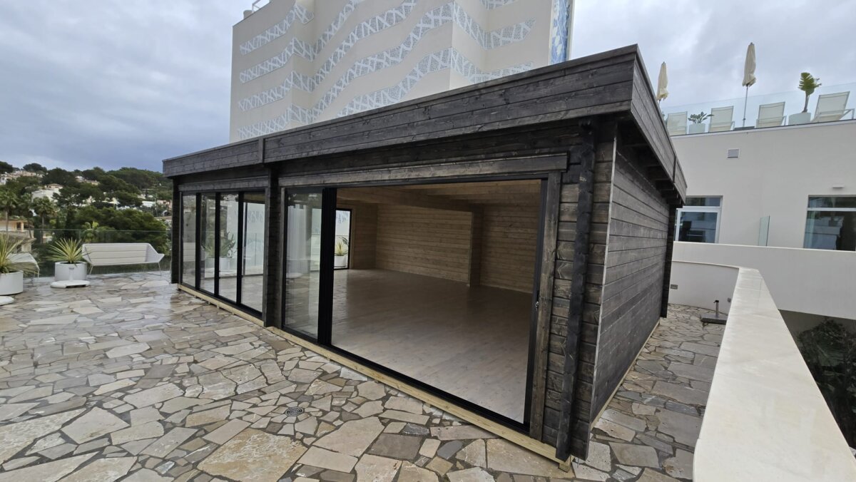 Esta impresionante caseta de jardín es una versión personalizada de nuestro popular modelo Rebeka. Para cumplir con los requisitos del hotel, ampliamos su tamaño a casi 50m² e incorporamos dos puertas correderas de aluminio adicionales en la pared lateral para mejorar la accesibilidad y la entrada de luz natural.