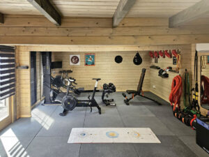 A esto hay que sumar el equipamiento deportivo (máquinas, pesas, suelo de goma, etc.). La ventaja es que se trata de una inversión a largo plazo: tu propio gimnasio privado, con calidades de casa de madera, uso intensivo y garantía de 5 años en los componentes de madera.