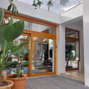 El modelo Olivia ALU, es ideal para quienes buscan un espacio personal para entrenar con calma y constancia. Por la mañana, puedes empezar el día con una sesión de cardio suave en la cinta, seguida de estiramientos o yoga frente a las puertas acristaladas, dejando que entre la luz natural y el aire fresco del jardín. Por la tarde, el espacio se adapta fácilmente a entrenamientos funcionales con mancuernas o a una rutina de fuerza rápida.
