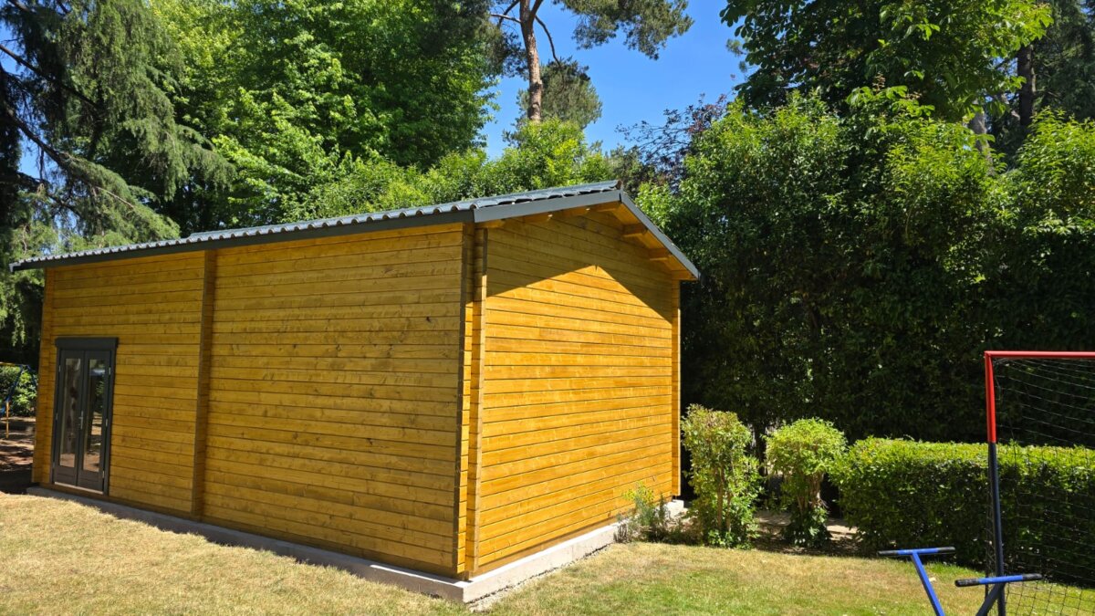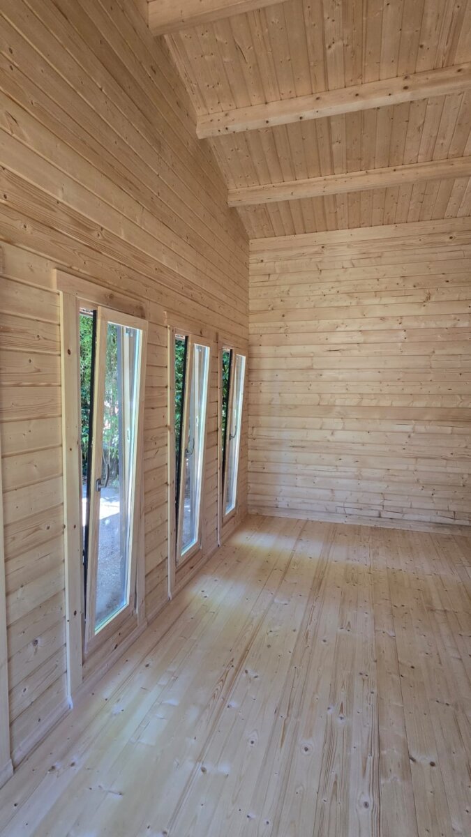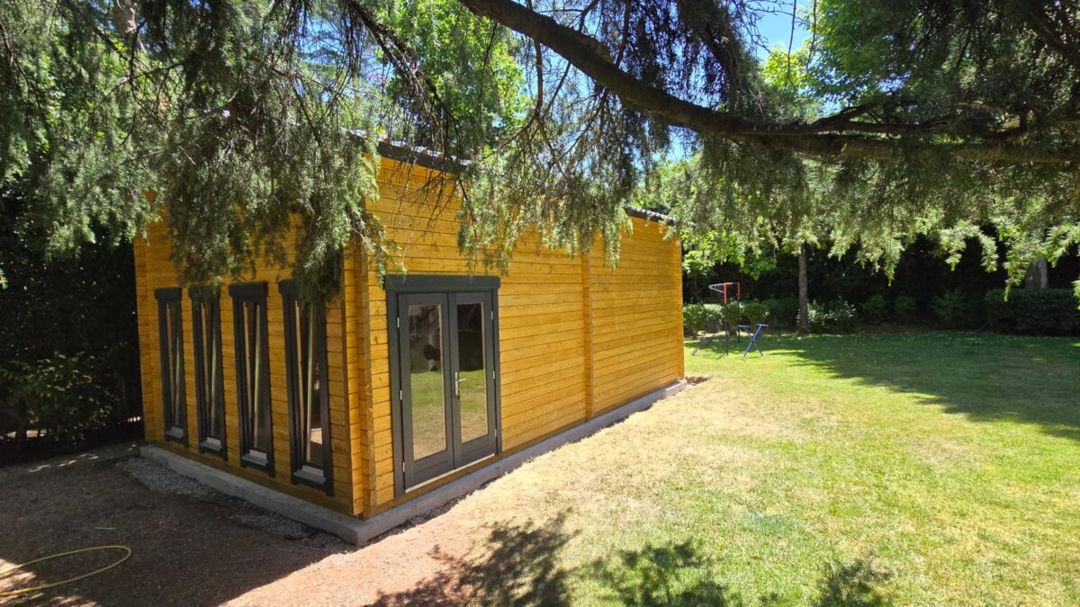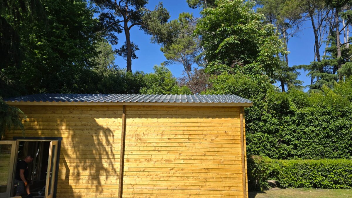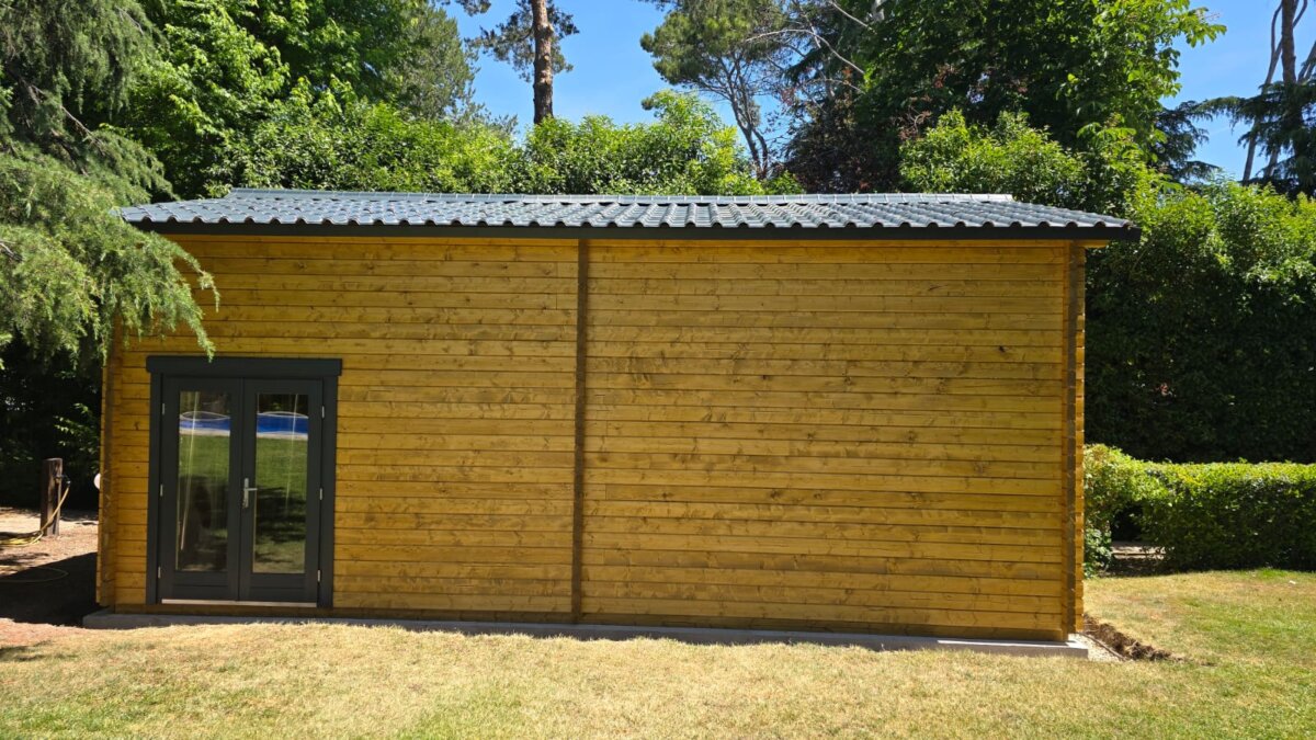 Based on our standard garden log cabin, the “Garden Golf Simulator Room Cabin 3”, we manufactured and installed a personalized cabin for a customer in Madrid. This custom cabin was made larger than the standard model.