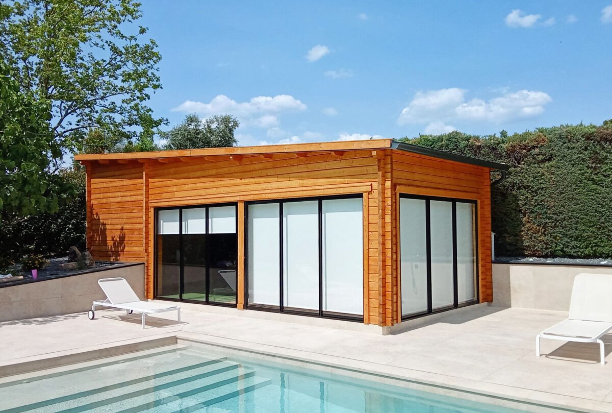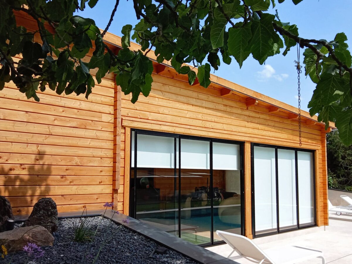This bespoke garden room is based on our popular Golf 5 model, with a customized enhancement—an additional sliding door. In total, the cabin features three nearly 3-meter-wide sliding doors, maximizing natural light and providing expansive views of the garden and pool area.