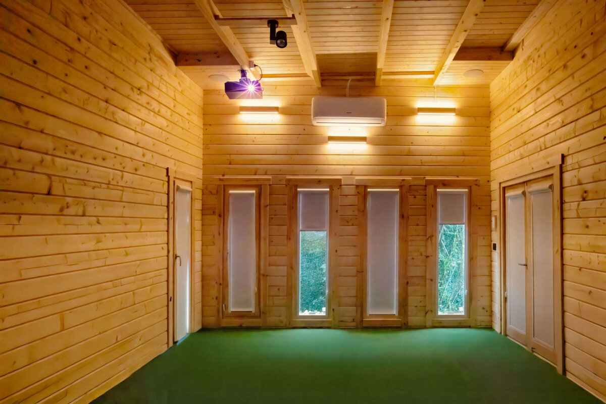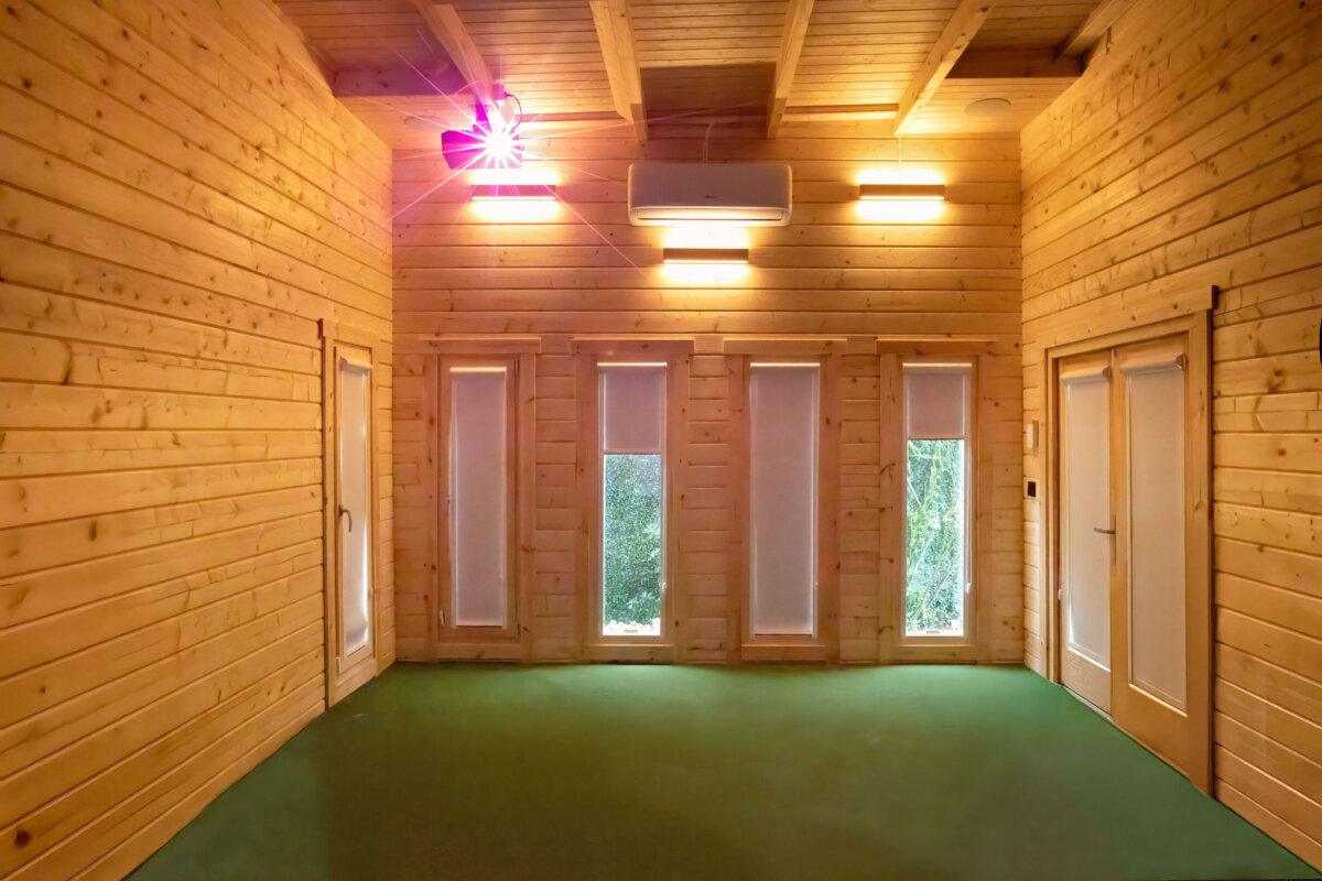 Our assembly team completed the cabin installation and painting within just four days. Once our part of the project was finished, a golf simulator company took over, installing a complete golf simulator system and covering the floor with artificial grass.