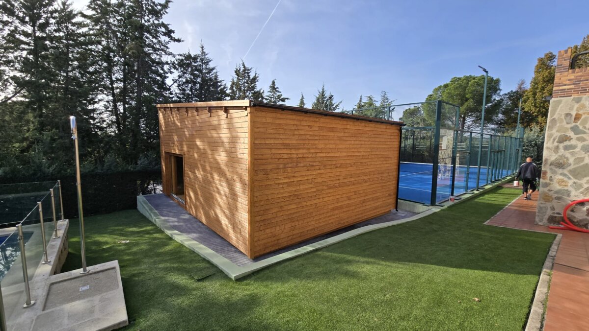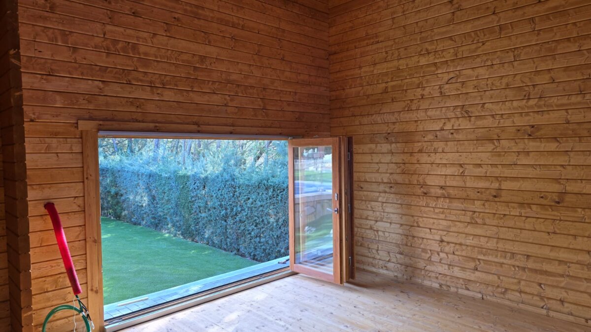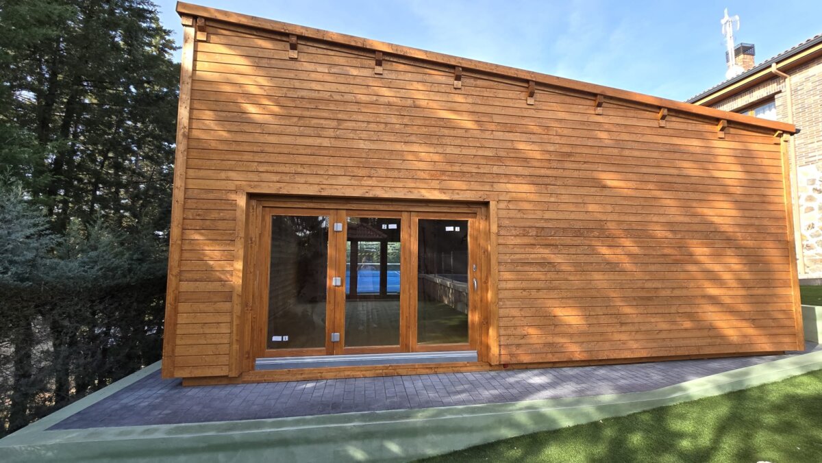 We recently completed a custom golf simulator cabin project for a client in Madrid. This spacious 6 x 8 m garden log cabin has been designed to serve multiple purposes, functioning not only as a golf simulator space but also as a home cinema and garden gym, providing our client with versatile year-round use.