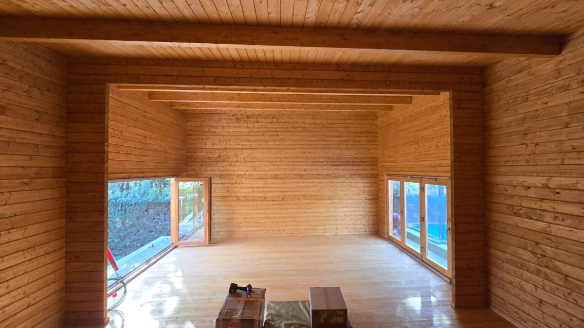 For the exteriors, we used Remmers HK Stain in a Chestnut color, while the interiors were finished with a lighter Stone Pine Larch tone to create a warm and inviting atmosphere.