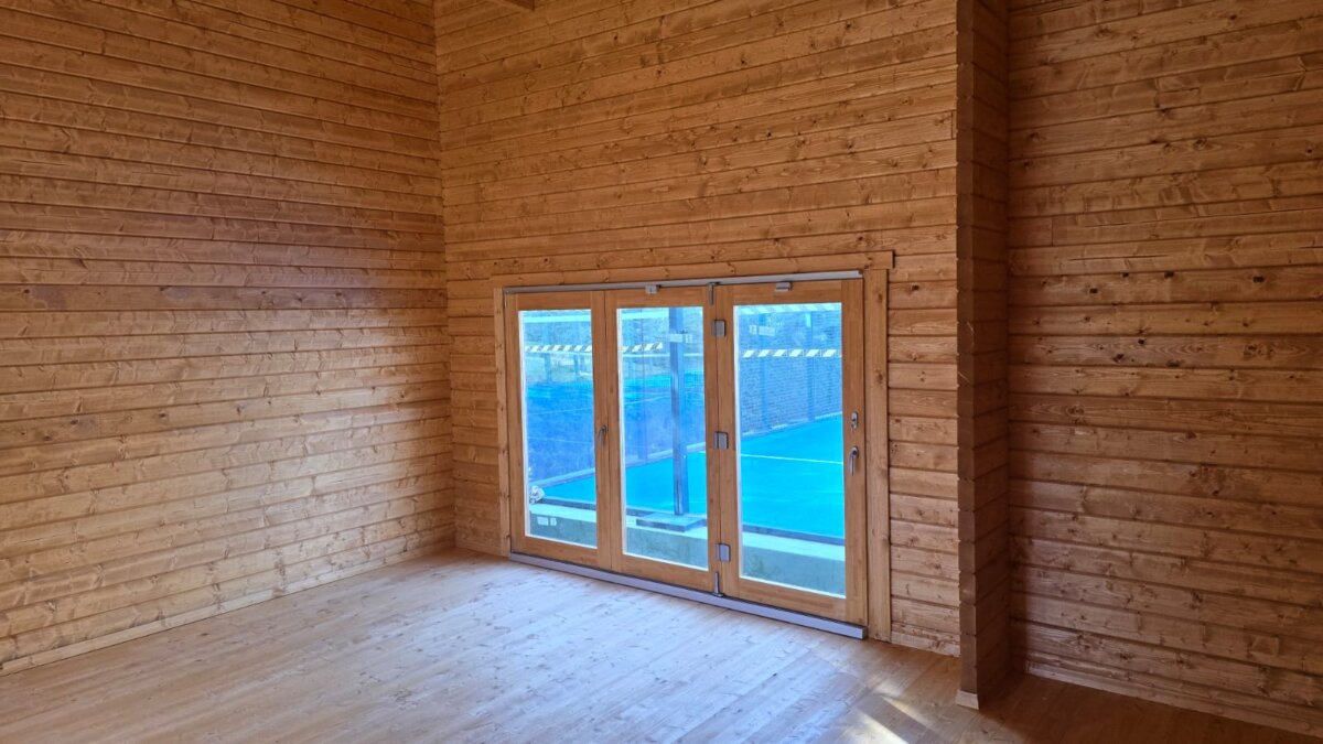 The design is based on our popular “Garden Golf Simulator Cabin 5,” but with significant modifications. The size was notably increased, and instead of two aluminum sliding doors, we installed premium-quality double-glazed bi-fold doors for an enhanced look and feel.