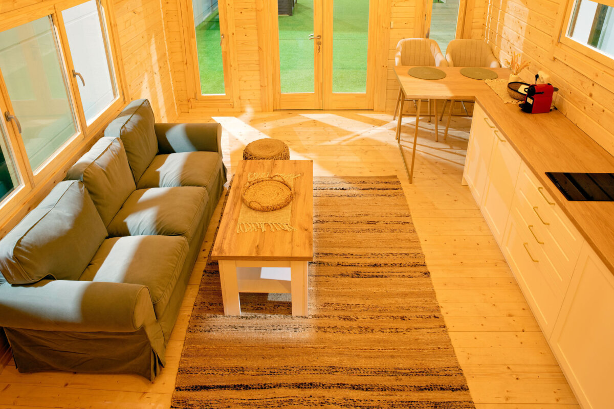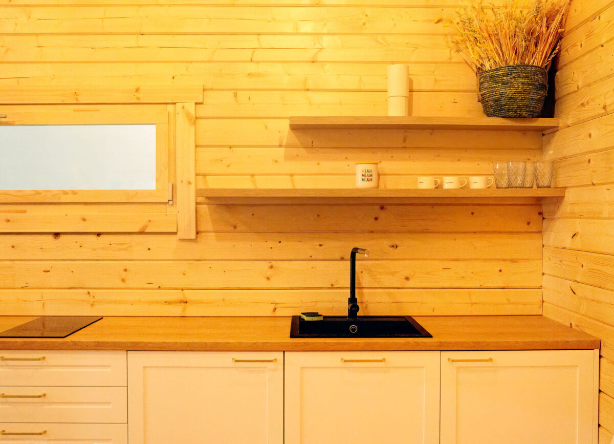 This cabin includes a fully fitted bespoke kitchen that can be ordered together with the cabin and installed by our team. You can order custom kitchen furniture in any size from us to ensure it fits perfectly into your cabin.