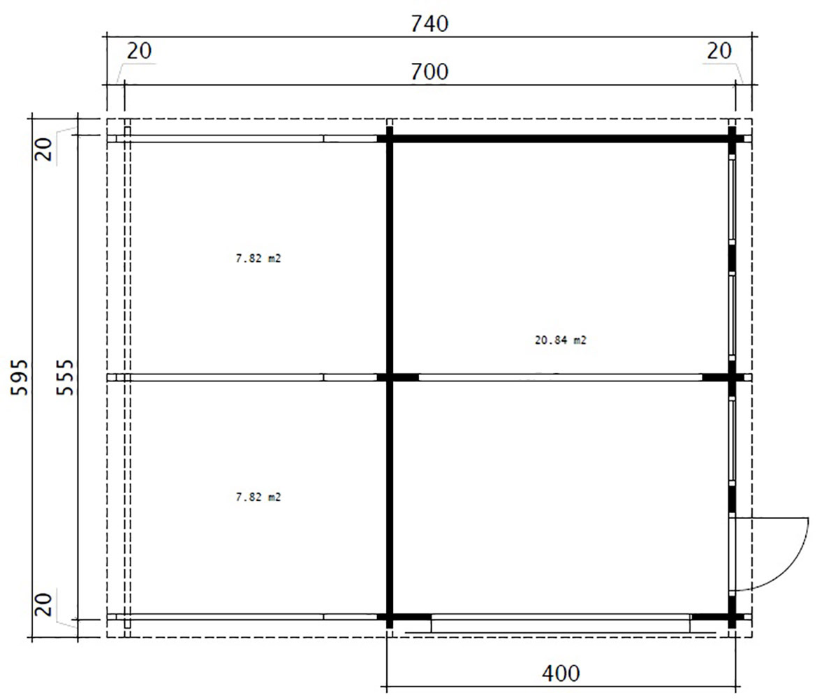 | External dimensions: | 7,2 m (23′ 7”) x 5,5 m (18′) |